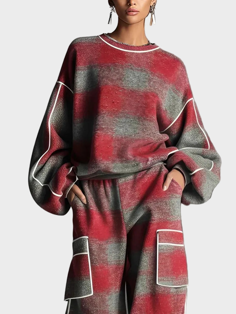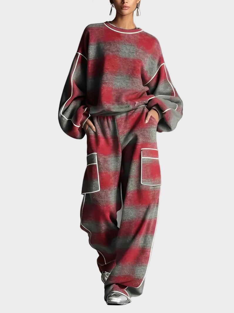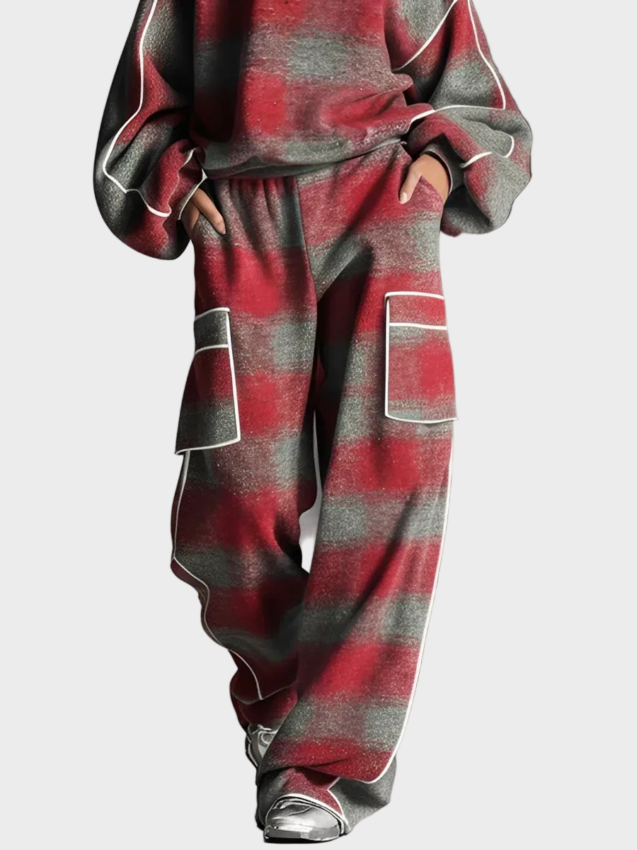 Set casual modern format dintr-un hanorac și pantaloni asortați, cu model în carouri roșii și gri. Hanoracul are o croială lejeră, mâneci largi și decolteu rotund, oferind confort și un stil relaxat. Pantalonii cu talie elastică au picioare largi și buzunare funcționale, asigurând practicitate și libertate de mișcare. Detaliile contrastante de pe cusături adaugă o notă contemporană setului. Ideal pentru ținute urbane, zile relaxate sau călătorii.