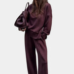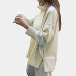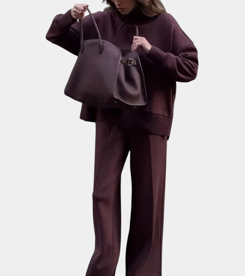 Setul care combină confortul cu eleganța. Puloverul cu guler înalt și fermoar lateral oferă un caracter modern, iar materialul moale îmbrățișează căldura și se simte plăcut pe piele. Pantalonii largi cu talie elastică și buzunare practice asigură libertate de mișcare și confort maxim.