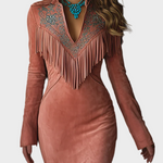 • Stil western exclusivist - Frangiurile, broderiile de la decolteu și designul de inspirație western fac această rochie unică, ideală pentru cei care doresc un look izbitor, plin de personalitate.
