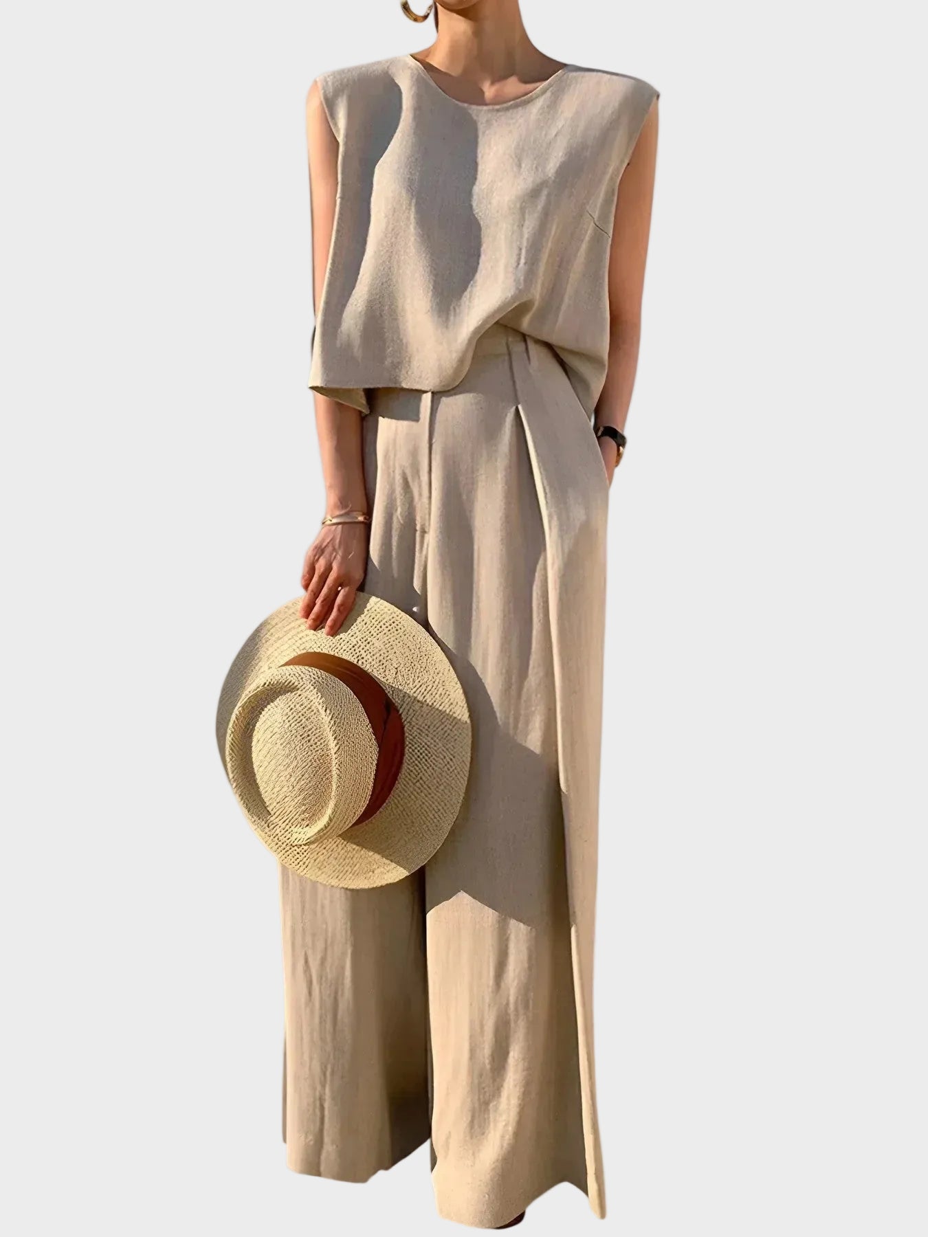 Design: Un set rafinat din două piese, cu un sacou cu croială relaxată și rever structurat, asociat cu pantaloni cu talie înaltă și croială dreaptă. Designul minimalist oferă un echilibru perfect între sofisticare și eleganță casual.